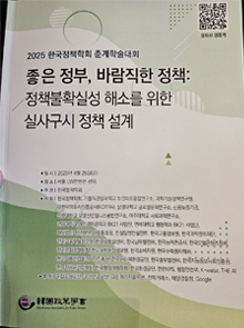 2025 한국정책학회 춘계학술대회세미나 주제 : 좋은 정부, 바람직한 정책: 정책불확실성 해소를 위한 실사구시 정책 설계 ![]() ![]() |